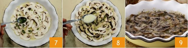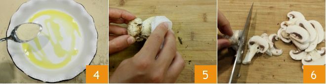 Fettet eine Auflaufform mit einem Durchmesser von 25 cm mit einem Schuss Öl ein und bestreut sie mit Semmelbröseln. Dann beginnt mit der Reinigung der Champignons (ihr könnt auch die Kochschule: Reinigung der Champignons konsultieren). Schneidet die Wurzeln der Pilze ab, reibt sie dann mit einem sauberen Tuch ab, um die Erde zu entfernen; anschließend in recht dünne Scheiben schneiden 6.