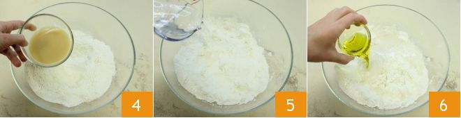 Dann fügt die in Wasser gelöste Hefe und das Malz in die Schüssel mit dem Mehl hinzu 4, anschließend auch das Wasser, in dem ihr das Salz aufgelöst habt 5. Gebt schließlich das Olivenöl dazu 6.
