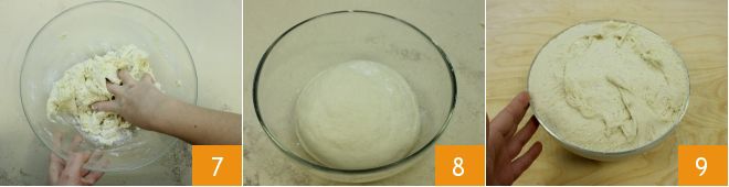 Beginnt dann, den Teig in der Schüssel zu kneten 7, übertragt den Teig auf eine bemehlte Arbeitsfläche und knetet weiter, bis er homogen und elastisch ist. Dann legt ihn in eine Schüssel 8 und bedeckt diese mit mikrowellengeeigneter Frischhaltefolie, dann stellt die Schüssel in den Samsung Smart Oven und wählt das automatische Gärprogramm 1-3 (max. Gewicht 900 g), der Teig wird so sein Volumen verdoppeln 9.