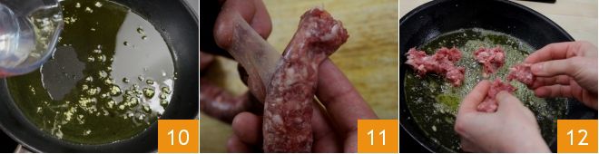 Während der Teig geht, bereitet ihr die Füllung zu: In einer großen Pfanne lasst ihr den gehackten Knoblauch im Öl anbraten 10. Entfernt währenddessen die Wursthaut 11, gebt dann das zerkleinerte Fleisch in die Pfanne 12 und lasst es unter Zugabe von wildem Fenchel und Rotwein köcheln. Salzt, pfeffert nach Belieben und lasst es etwa 10 Minuten kochen.