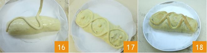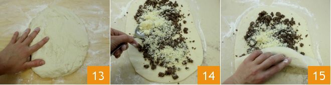 Nach Abschluss des Gärprogramms nehmt den Teig und rollt ihn auf einer bemehlten Arbeitsfläche aus 13, sodass er eine ovale Form annimmt; dann gebt die weiße Wurstfüllung darauf, lasst jedoch ein paar Zentimeter Rand frei und bestreut mit geriebenem Käse 14. Beginnt, den Strudel von der schmaleren Seite her aufzurollen 15.