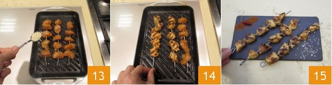 und bestreuen Sie sie mit Sesamsamen 13. Warten Sie 3-4 Minuten, bis sie gut gebräunt und leicht karamellisiert sind. Dann drehen Sie sie um 14, beenden Sie das Garen für weitere 2-3 Minuten und servieren Sie Ihre würzigen Hähnchenspieße 15.