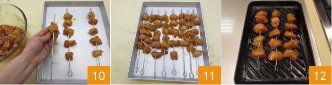 Nach dieser Zeit nehmen Sie die Metallspieße (oder Holzspieße) und stecken die Fleischstücke auf 10, lassen Sie dabei etwas Platz zwischen den Würfeln. Sobald alle Spieße fertig sind 11, legen Sie sie auf einen leicht geölten, heißen Grill 12,