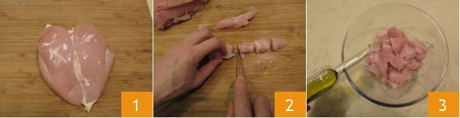 Um die würzigen Hähnchenspieße zuzubereiten, beginnen Sie mit dem Fleisch. Nehmen Sie die Hähnchenbrust 1 und schneiden Sie sie zuerst in Streifen und dann in Würfel von etwa 2 cm pro Seite 2. Geben Sie diese in eine Schüssel und fügen Sie das Öl hinzu 3.