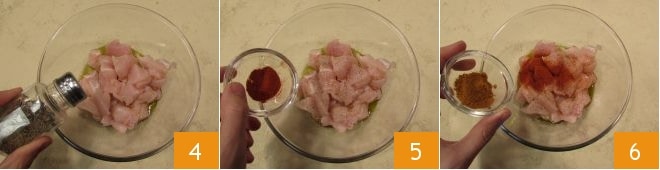 Salzen und pfeffern Sie 4 und fügen Sie auch die Gewürze hinzu: zuerst den Cayennepfeffer 5 und dann das Paprikapulver 6.
