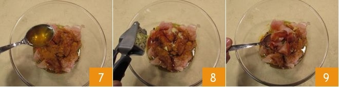Fügen Sie zuletzt den Honig hinzu 7, den zerdrückten Knoblauch 8 und mischen Sie alles gut durch 9. Decken Sie die Schüssel mit Frischhaltefolie ab und stellen Sie sie für mindestens 2 Stunden, am besten über Nacht, in den Kühlschrank zum Marinieren.