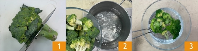 Um den würzigen Brokkoli-Hummus mit Joghurt zuzubereiten, reinigen Sie zuerst den Brokkoli: Sie sollten etwa 300 g Röschen erhalten 1. Kochen Sie die Röschen in kochendem Salzwasser für ca. 5 Minuten 2, dann lassen Sie sie in einer Schüssel mit kaltem Wasser und Eis abkühlen 3; auf diese Weise stoppen Sie den Garvorgang und die Farbe bleibt leuchtend.