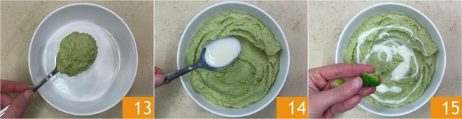 Salzen Sie 7, dann fügen Sie das Tahini 8 und den Honigjoghurt hinzu 9.