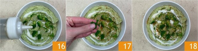 Vervollständigen Sie mit einem Schuss Öl 16, einer Prise Paprika und einigen Blättern Petersilie 17. Ihr würziger Brokkoli-Hummus mit Joghurt ist bereit zum Servieren 18!