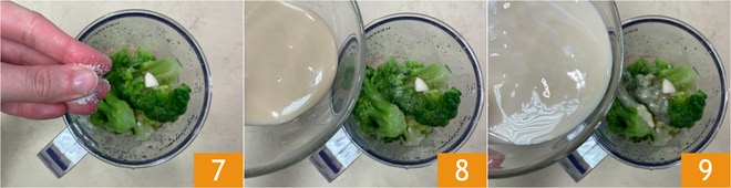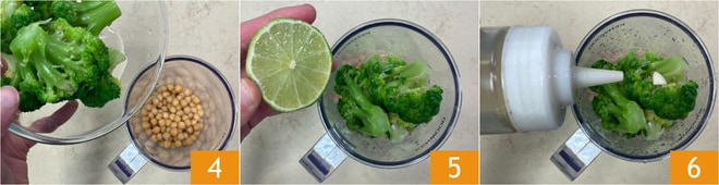 Geben Sie die abgetropften Kichererbsen in den Behälter eines Mixers, dann fügen Sie fast alle Brokkoli hinzu und lassen einige für die Dekoration beiseite 4. Fügen Sie den Limettensaft 5, den Knoblauch und das Öl hinzu 6.