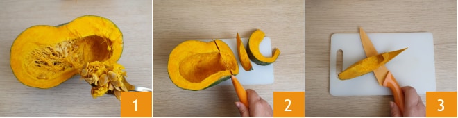 Um die Torta Tenerina mit Kürbis zuzubereiten, kümmern Sie sich zuerst um die Reinigung des Kürbisses: Entfernen Sie die inneren Samen 1, schneiden Sie ihn in Scheiben 2 und entfernen Sie die Schale 3. Sie benötigen 500 g gereinigten Kürbis.
