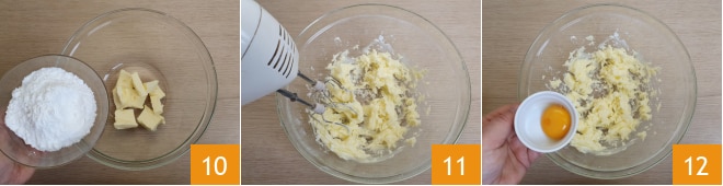 In einer anderen Schüssel geben Sie die weiche Butter zusammen mit dem Puderzucker 10 und arbeiten Sie mit den elektrischen Rührgeräten 11. Fügen Sie ein Eigelb nach dem anderen hinzu 12