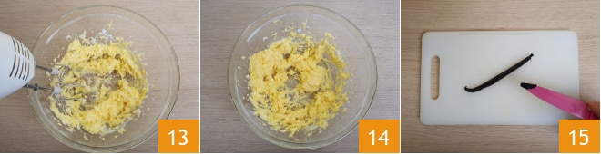 und verarbeiten Sie die Mischung 13, bis sie gut aufgenommen ist, bevor Sie das nächste hinzufügen. Sie sollten eine gut aufgeschlagene Masse erhalten 14. Nehmen Sie an dieser Stelle die Samen aus der halben Vanilleschote 15