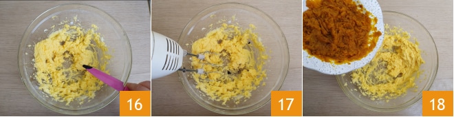 und geben Sie sie zur Mischung hinzu 16. Rühren Sie mit dem Rührgerät 17 und fügen Sie das Kürbispüree hinzu 18.
