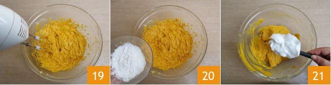 Vermischen Sie es mit den Rührgeräten 19. Fügen Sie anschließend die Speisestärke hinzu 20 und rühren Sie mit einem Spatel. Schließlich heben Sie nach und nach die steif geschlagenen Eiweiße unter 21,