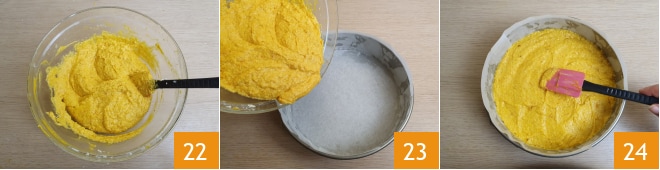 mit Bewegungen von unten nach oben, um eine sanfte und luftige Mischung zu erhalten 22. Legen Sie eine 24 cm große Springform mit Backpapier aus und gießen Sie die Mischung hinein 23. Glätten Sie sie gut 24