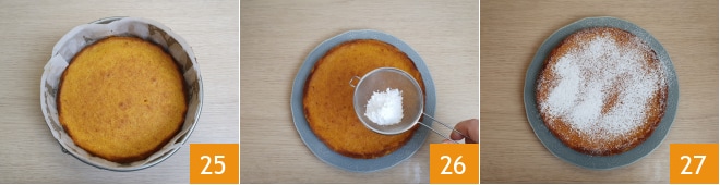 und backen Sie sie im vorgeheizten statischen Ofen bei 170°C für 35 Minuten. Machen Sie den Stäbchentest, bevor Sie den Kuchen aus dem Ofen nehmen 25. Wenn er fertig und abgekühlt ist, nehmen Sie ihn aus der Form und bestäuben ihn mit Puderzucker 26 vor dem Servieren 27.