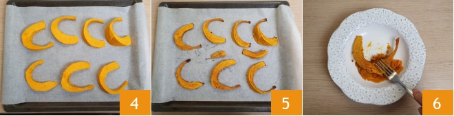 Legen Sie die Kürbisscheiben auf ein mit Backpapier ausgelegtes Blech 4 und backen Sie sie im vorgeheizten statischen Ofen bei 180°C für 35 Minuten 5. Wenn sie fertig sind, geben Sie sie auf einen Teller und zerdrücken Sie sie mit einer Gabel 6,