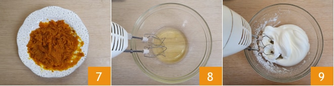 um ein Püree zu erhalten 7. Sie sollten etwa 250 Gramm erhalten, die Sie beiseite stellen (wenn Sie mehr Püree übrig haben, können Sie es verwenden, um eine Gemüsesuppe oder Suppe zu bereichern). Trennen Sie die Eigelbe von den Eiweißen und schlagen Sie die Eiweiße 8 zu steifem Schnee 9, ohne etwas hinzuzufügen. Beiseite stellen.