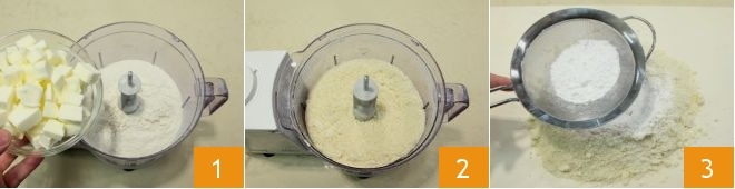 Um die Zauberstäbe herzustellen, beginnen Sie mit dem Mürbeteig. Geben Sie in einen Mixer das gesiebte Mehl, eine Prise Salz und die kalte Butter in Stückchen geschnitten 1. Mixen Sie alles, bis Sie einen sandigen Teig erhalten 2 und geben Sie das Gemisch auf die Arbeitsfläche, zu der Sie auch den gesiebten Puderzucker hinzufügen 3.