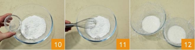 In der Zwischenzeit bereiten Sie die Wasserglasur vor. Erhitzen Sie in einem kleinen Topf eine kleine Menge Wasser und geben Sie es nach und nach zum Puderzucker 10. Mit einem Schneebesen lassen Sie den Zucker schmelzen: Wenn die Glasur zu flüssig ist, fügen Sie mehr Zucker hinzu, andernfalls, wenn sie zu dick ist, verdünnen Sie sie mit etwas heißem Wasser 11. Wenn Sie eine flüssige und glatte Konsistenz erreicht haben, teilen Sie die Glasur in zwei Schalen und decken Sie beide mit Frischhaltefolie ab, die direkt auf der Oberfläche aufliegt 12.