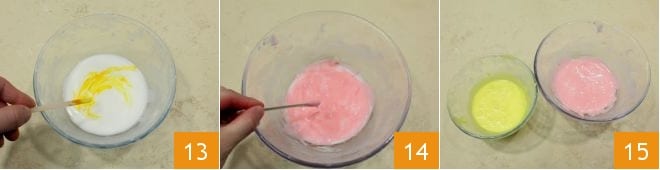 Fahren Sie nun mit dem Färben der Glasur fort, indem Sie eine Portion abgedeckt halten, während Sie an der anderen arbeiten. Fügen Sie jeweils die gelbe Lebensmittelfarbe in eine der beiden Schalen 13 und die pinke in die andere hinzu 14 und mischen Sie die Farbe gut, um die gewünschte Intensität zu erreichen 15. Sobald Sie fertig sind, halten Sie die Glasuren bis zu ihrem Gebrauch mit Frischhaltefolie bedeckt.