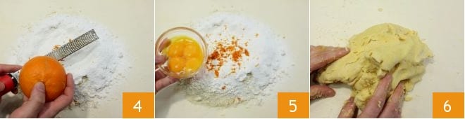 Formen Sie die klassische Form eines Brunnens, und reiben Sie dann, nachdem Sie sie gut gereinigt und getrocknet haben, die Orangenschale in die Mischung ein 4. Fügen Sie nun die Eigelbe hinzu 5 und schlagen Sie sie leicht mit einer Gabel in das Mehl, um sie aufzunehmen. Sie können nun mit der manuellen Verarbeitung fortfahren 6: Kneten Sie kurz, nur um den Mürbeteig zu festigen.