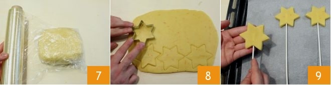 Formen Sie nun einen Teigball, flachen Sie ihn leicht ab und wickeln Sie ihn in Frischhaltefolie ein, die direkt aufliegt 7. Lassen Sie ihn mindestens 30 Minuten im Kühlschrank fest werden. Nach dieser Zeit rollen Sie den Teig auf eine Dicke von etwa 1 cm aus und stechen Sterne mit einer Form von etwa 7 cm aus 8. Stecken Sie den Lebensmittelspieß vorsichtig in die Mitte des Sterns 9 und verteilen Sie sie alle auf ein mit Backpapier ausgelegtes Blech. Backen Sie in einem vorgeheizten statischen Ofen bei 200° für 20 Minuten (bei Umluft 180° für 10 Minuten). Nach dem Backen lassen Sie die Kekse vollständig abkühlen.
