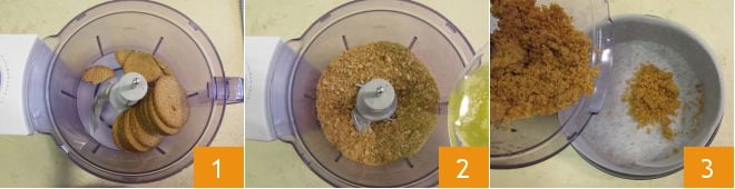 Um den Zebra-Käsekuchen herzustellen, kümmern Sie sich zuerst um den Boden: Geben Sie die Kekse 1 in die Schüssel eines Mixers und zerkleinern Sie sie fein, fügen Sie die geschmolzene Butter 2 hinzu und mischen Sie, um sie zu vermengen. Geben Sie die erhaltene Mischung 3 in eine Springform mit einem Durchmesser von 20 cm, die sowohl am Boden als auch am Rand mit Backpapier ausgelegt ist.