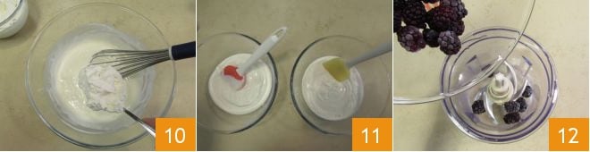 Nun heben Sie die geschlagene Sahne vorsichtig unter den Joghurt 10. Teilen Sie die Mischung in zwei Teile: einen mit 250 g und einen mit etwa 650 g 11. Pürieren Sie die gereinigten Brombeeren im Mixer 12.
