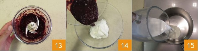 Sie sollten ein glattes Püree erhalten 13, das Sie dem 250 g schweren Teil hinzufügen 14. In der Zwischenzeit erhitzen Sie 20 g flüssige Sahne, indem Sie sie gleichmäßig auf zwei kleine Töpfe verteilen 15.