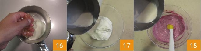 Lösen Sie jeweils 9 g und 5 g weich gewordene und gut aus dem Wasser gedrückte Gelatine auf 16. Die Sahnemischung, in der Sie 5 g Gelatine aufgelöst haben, wird der hellen Creme hinzugefügt 17, während die Mischung mit 9 g Gelatine der Brombeercreme hinzugefügt wird 18.