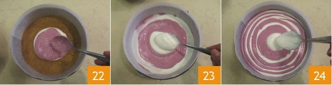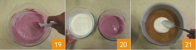 Rühren Sie die Mischungen sorgfältig um 19 und, sobald sie fertig sind 20, nehmen Sie die Form mit dem Keksboden und geben Sie zwei Löffel der hellen Mischung in die Mitte 21.