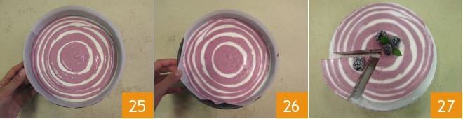 Verteilen Sie die Creme mit der Rückseite des Löffels in der Mitte und dann zwei Esslöffel Brombeercreme darüber 22. Fahren Sie fort, indem Sie die Cremes abwechseln 23 24.
