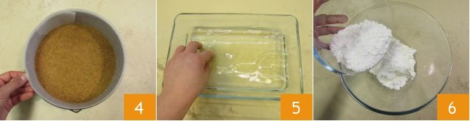 Verdichten Sie die Mischung mit der Rückseite eines Löffels 4 und stellen Sie sie für 30 Minuten in den Kühlschrank, um sie festwerden zu lassen. Weichen Sie 9 g Gelatine in einer kleinen Schüssel mit kaltem Wasser ein (diese wird für die dunkle Creme benötigt) und weichen Sie die anderen 5 g in einer separaten Schüssel ebenfalls in kaltem Wasser ein 5. In der Zwischenzeit geben Sie den Joghurt in eine große Schüssel und fügen Sie den Puderzucker hinzu 6.