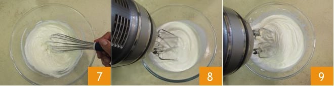 Mischen Sie, um es zu vermengen 7, und stellen Sie es beiseite. Geben Sie die flüssige Sahne in eine andere Schüssel 8 und schlagen Sie sie mit einem elektrischen Mixer, bis sie schaumig ist 9.