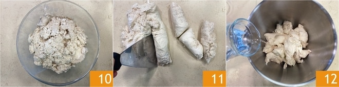 Holen Sie jetzt den Vorteig heraus 10, teilen Sie ihn in kleinere Stücke 11 und geben Sie ihn in die mit einem Knethaken ausgestattete Küchenmaschine. Fügen Sie 3/4 der für den Teig vorgesehenen Wassermenge hinzu und lassen Sie die Maschine laufen 12.