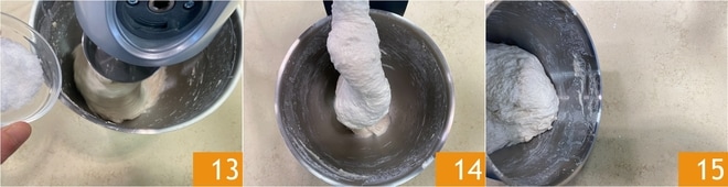 Sobald der Teig sich verbunden hat, fügen Sie das Salz hinzu 13 und das restliche Wasser, indem Sie es in einem dünnen Strahl einfließen lassen. Kneten Sie, bis der Teig glatt, homogen und sehr widerstandsfähig ist 14. Geben Sie ihn auf eine Arbeitsfläche 15.