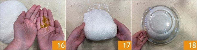 Ölen Sie Ihre Hände mit etwas Öl 16 und machen Sie einige Verstärkungsfalten 17, dann decken Sie den Teig mit einer Schüssel (oder einem Tuch) ab und lassen ihn 10 Minuten bei Raumtemperatur ruhen 18.