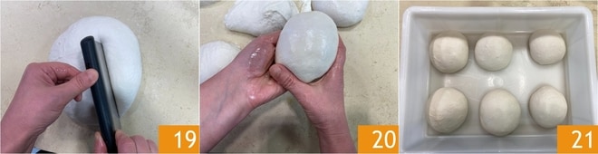 Teilen Sie den Teig mit einem Teigschaber in 6 Stücke von etwa 250-280 g 19. Formen Sie die Teiglinge, indem Sie den Teig nach unten drücken, dann greifen Sie ihn zwischen Daumen und Zeigefinger und "kneifen" ihn, um ihn zu verschließen, wie beim Mozzarella 20. Formen Sie die Teiglinge und geben Sie sie nach und nach in die Gärbox 21.