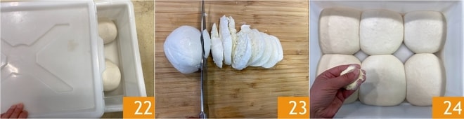Decken Sie die Box mit dem entsprechenden Deckel ab 22 und lassen Sie den Teig 4 Stunden bei Raumtemperatur gehen. Schneiden Sie inzwischen den Mozzarella in Scheiben 23 und drücken Sie ihn vorsichtig aus, um überschüssige Flüssigkeit zu entfernen. Nach der Gärzeit bestäuben Sie die Teiglinge mit Hartweizengrieß 24 und nehmen Sie sie vorsichtig heraus, um sie nacheinander auszurollen.