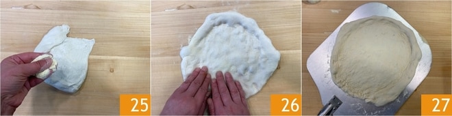 Rollen Sie einen Teigling von Hand mit etwas Hartweizengrieß aus 25. Drücken Sie mit den Fingern auf den mittleren Teil und schieben Sie die Luft nach außen, um so den Rand zu formen 26. Drehen Sie den Teig um und wiederholen Sie den Vorgang auf der anderen Seite. Legen Sie den Pizzaboden auf den Schieber 27