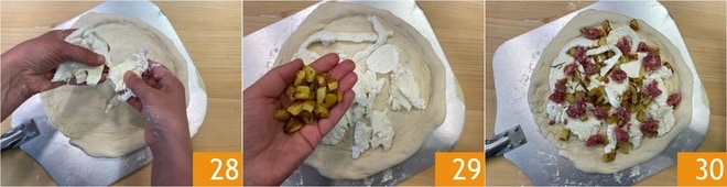 Belegen Sie die Pizza mit dem Mozzarella 28, den ofengebackenen Kartoffeln 29 und der zerbröselten Wurst 30. Backen Sie die Pizza im vorgeheizten, statischen Ofen bei 250° für 5-7 Minuten auf dem zuvor aufgeheizten Pizzastein.