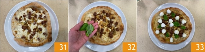 Holen Sie die zeitgenössische Pizza mit Wurst und Kartoffeln aus dem Ofen 31 und bevor Sie sie heiß servieren, garnieren Sie sie mit frischem Basilikum 32, Büffelmozzarella-Stücken und einem Schuss nativem Olivenöl 33.