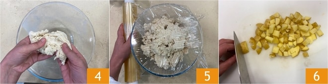 Der Teig sollte sehr grob und nicht homogen sein, daher zerreißen Sie ihn 4 und legen Sie ihn in eine Schüssel. Decken Sie ihn mit Frischhaltefolie ab 5 und lassen Sie ihn eine Stunde bei Raumtemperatur ruhen, danach stellen Sie ihn für 24 Stunden in den Kühlschrank. Am nächsten Tag beginnen Sie mit der Zubereitung der Kartoffeln: Schälen Sie sie und schneiden Sie sie in 1 cm große Würfel 6.