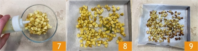 Würzen Sie sie mit Öl 7, Salz und Pfeffer, dann legen Sie die Kartoffeln auf ein mit Backpapier ausgelegtes Backblech und backen Sie sie bei Umluft bei 220° etwa 20 Minuten 9.