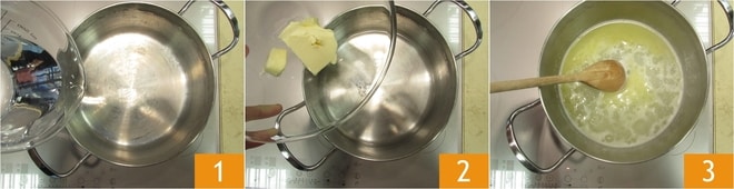 Um die Zeppole mit Mascarpone- und Kaffeesahne zuzubereiten, machen Sie zuerst den Brandteig. In einem Topf Wasser 1 und Butter 2 einfüllen. Mittlere Hitze einstellen und kurz vor dem Kochen bringen, dabei umrühren, um die Butter aufzulösen 3.
