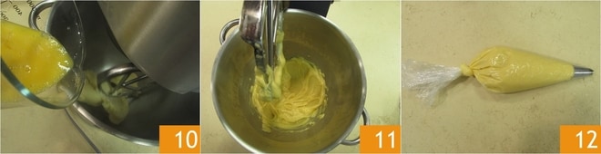 Wenn der Teig nicht mehr dampft, geben Sie die Eier nach und nach hinzu 10. Dies kann einige Minuten dauern, aber wir empfehlen, diesen Schritt langsam zu machen, um einen guten Brandteig zu erhalten. Wenn Sie eine glatte und homogene Masse 11 erhalten haben, schalten Sie die Küchenmaschine aus und übertragen Sie den Teig mit einem Teigschaber in einen Spritzbeutel mit einer Sterntülle von 6 mm 12. Legen Sie ihn bis zur Verwendung in den Kühlschrank.