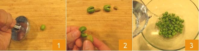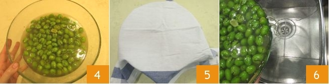 Um die zerdrückten Oliven herzustellen, beginnen Sie morgens, da Sie das Einweichwasser ein paar Mal am Tag, morgens und abends, wechseln müssen. Nehmen Sie frische grüne Oliven (wählen Sie möglichst die fleischigsten und größten), schlagen Sie sie mit einem Fleischklopfer 1, sodass sie halbiert werden, ohne sie komplett zu zerbrechen, und entfernen Sie den Kern 2. Legen Sie sie in eine große Schüssel und füllen Sie Wasser ein 3