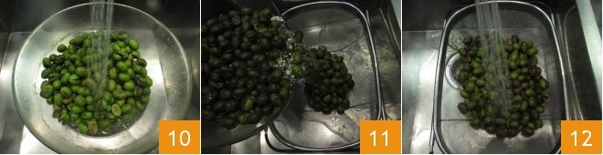 und bedecken Sie sie erneut mit frischem Wasser 10; lassen Sie die Oliven dann bis zum nächsten Tag ruhen. Am siebten Tag spülen, salzen und erneut mit Wasser bedecken; lassen Sie sie dann bis zum achten Tag ruhen, wenn Sie Ihre zerdrückten Oliven abgießen können, die inzwischen ziemlich dunkel erscheinen 11; spülen Sie sie gründlich unter fließendem Wasser ab 12